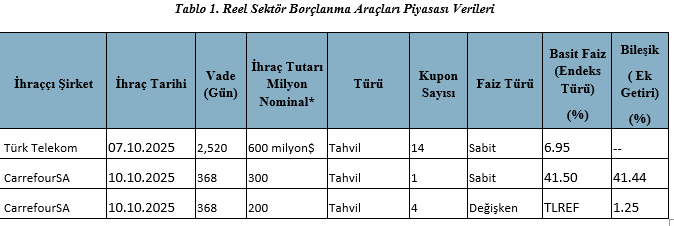 Geçtiğimiz hafta içerisinde gerçekleşen borçlanma aracına ilişkin veriler aşağıda yer almaktadır. Bu hafta reel sektör borçlanma aracı sayısı son derece azdı. Türk Telekom İrlanda da dolar cinsi tahvil ihrac etti. CarrefourSA ise hem sabit hem değişken faizle tahvil çıkardı.