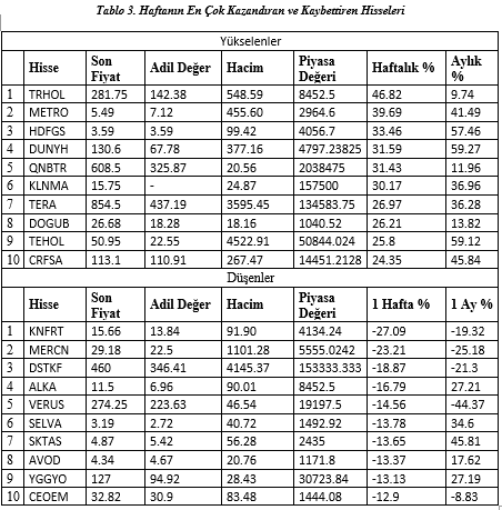 Geçen haftanın Borsa İstanbul performansına baktığımızda, TRHOL, METRO, HDFGS ve DUNYH gibi hisseler öne çıktı. TRHOL yüzde 46,8 ile haftanın en çok kazandıranı olurken, son fiyatı 281,75 ₺ ile adil değerinin yaklaşık iki katına ulaştı. Benzer şekilde METRO ve HDFGS, aylık bazda da çift haneli yükselişler göstererek yatırımcıların dikkatini çekti. Özellikle DUNYH ve TEHOL gibi hisselerde, son fiyatların adil değerlerinin oldukça üzerinde oluşu, piyasa ilgisinin ve kısa vadeli momentumun yüksek olduğunu gösteriyor. Bu hisseler, yüksek getiri potansiyeli arayan yatırımcılar için öne çıkan seçenekler arasında yer aldı.
