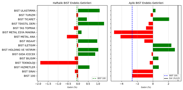 Borsa İstanbul’da yer alan endeksler ve getirilerini gösteren grafik aşağıda verilmiştir. Grafikler soldan sağa sırası ile haftalık ve aylık (son 4 hafta) değişimi göstermektedir. Her iki grafikte de son satır BİST 100 endeksini gösterirken grafikteki çizgiler BİST 100 endeksindeki getiri yüzdesini vermektedir.