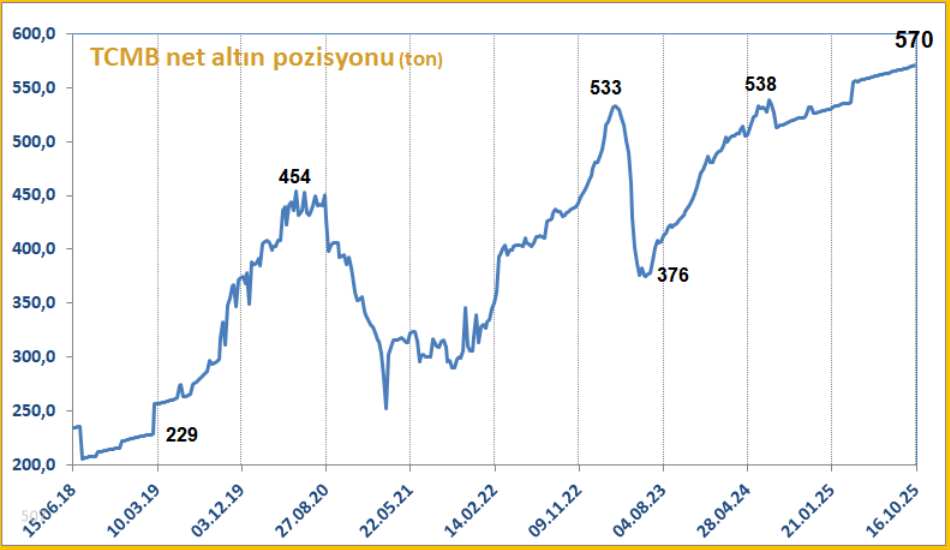 TCMB brüt altın rezervlerinde düşüş 2 tonun üzerinde düşüş görülünce TCMB’nin altın sattığı iddia edildi. Hatta altın rezervin riski yüksek olduğu için altın satarak dövize çevirdi vb yorumları yapıldı. Fakat TCMB’nin brüt altın rezervi tıpkı brüt döviz rezervi gibi çeşitli kalemlerden ve emanetlerden oluşuyor. Altın satışı olması için net altın rezervinde bir düşüş gerekli. e507’nin X hesabında yayınladığı grafikte görüldüğü üzere net altında düşüş yok. Yani TCMB altın satmamış. Ancak bu TCMB’nin altın satmayacağı anlamına gelmiyor. Geçmiş dönemlerde de benzer operasyonlar yürütüldü.
