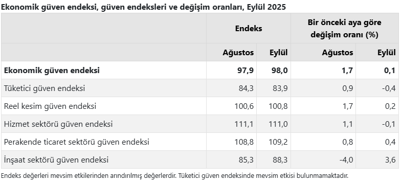 Eylül 2025’te Türkiye’nin ekonomik güven endeksi %0,1 artarak 98,0 seviyesine yükseldi ve son dönemde temkinli bir iyileşme gösterdi. İnşaat sektörü güven endeksi %3,6, perakende ticaret %0,4 ve reel kesim (imalat sanayi) %0,2 artış gösterirken, hizmet sektörü %0,1 ve tüketici güven endeksi %0,4 geriledi. Bu durum, ekonominin bazı sektörlerde toparlandığını, ancak tüketici güveninde hâlâ temkinli bir duruşun sürdüğünü gösteriyor. İç talep, özellikle inşaat ve perakende üzerinden sınırlı da olsa canlanma eğiliminde.