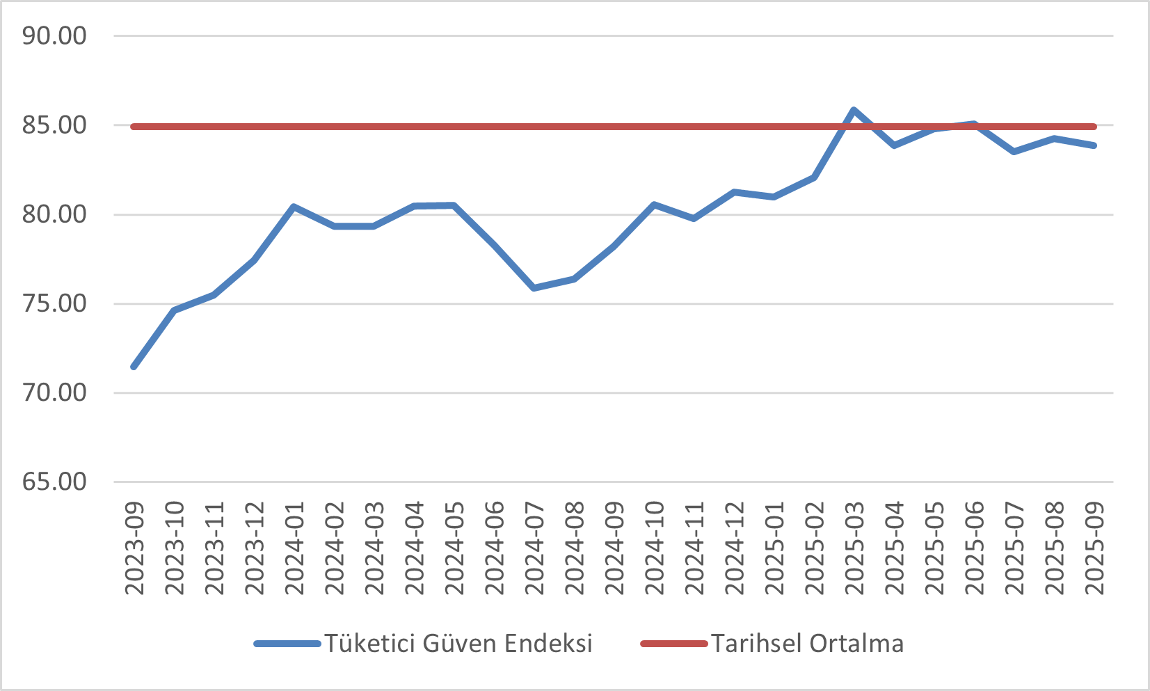 Eylül 2025’te Tüketici Güven Endeksi 83,87 ile ortalamaya yakın seyrediyor. Hanelerin mevcut mali durumu ve ekonomik algısı ortalamanın altında, işsizlik beklentisi ise yükselmiş durumda. Buna rağmen dayanıklı ve yarı dayanıklı mallara harcama eğilimi ile otomobil ve konut alım ihtimali artış gösteriyor. Tasarruf eğilimi zayıf, borçlanma isteği güçlü. Hissedilen enflasyon düşük, ücret beklentisi ise yüksek. Genel olarak haneler kısa vadede temkinli, orta vadede ise harcamaya ve gelir artışına odaklı.
