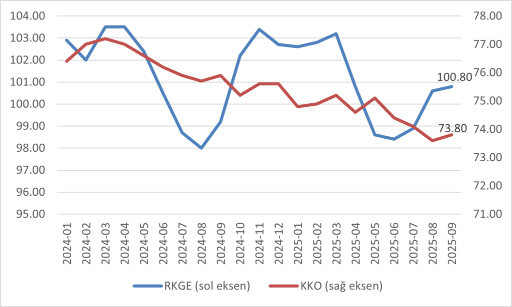 Eylül 2025’te PMI 53,6’ya gerileyerek büyümenin hız kestiğini gösterdi. Hizmetler sektörü özellikle yavaşladı, imalat tarafında da Ağustos’taki zirveden geri çekilme var. Maliyetler tarifeler nedeniyle hızla artarken, şirketlerin satış fiyatlarını artırma kapasitesi sınırlı kaldı. Bu, kâr marjlarını baskılayabilir. Yine de iş dünyası güveninde yükseliş dikkat çekiyor.