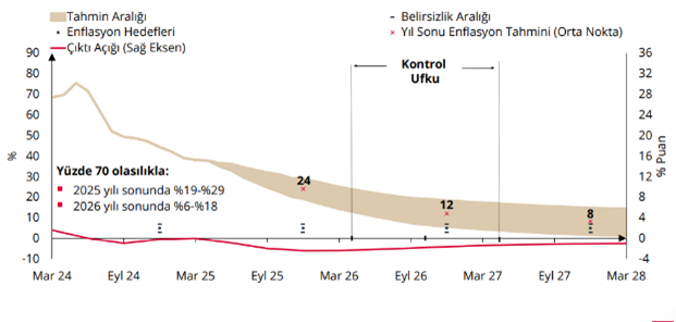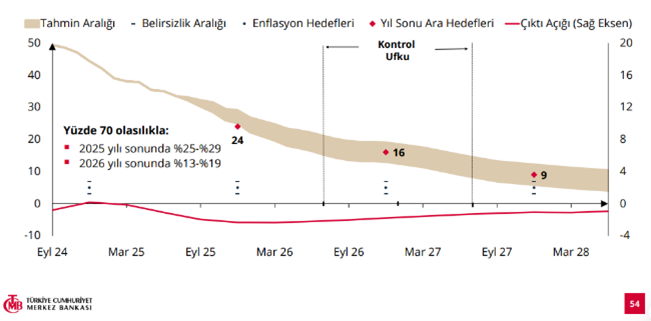 2025 Ağustosundaki 3. Enflasyon Raporu’nda (şekil 3) ise bu kez çok daha güçlü bir çıktı açığı beklentisi paylaşıldı ve enflasyonun 2,5 yıl içinde tek haneye ineceği iddia edildi. Ancak son açıklanan büyüme verileri bu tahminin de isabetsiz olduğunu gösterdi.